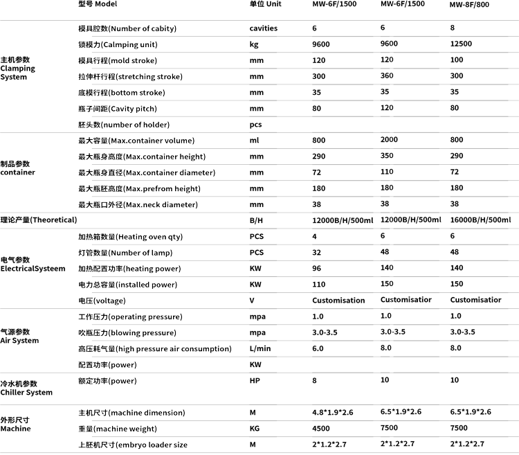 采用伺服電機(jī)驅(qū)動環(huán)形鏈條; 采用伺服單通道上胚; 采用鋁合金制造的高壓吹氣組合閥,可有氣體回收裝置,減少能源消耗,保護(hù)環(huán)境; 采用PID恒定控制烤箱瓶胚加熱和風(fēng)機(jī)排風(fēng)。